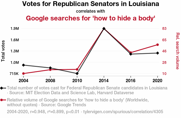 User prompt: Please provide potential search keywords for a paper titled Revealing the Republican Relationship: Senators, Searches, and Sinister Suggestions in Louisiana with an abstract of In the realm of political behavior and online inquiries, our eyebrow-raising study delves into the correlation between Republican votes for Senators in Louisiana and Google searches for "how to hide a body." Utilizing data from the MIT Election Data and Science Lab, Harvard Dataverse, and Google Trends, we embarked on this curious investigation. Our findings unveiled a striking correlation coefficient of 0.9479636, with a statistically significant p-value of less than 0.01 for the years spanning 2004 to 2020.