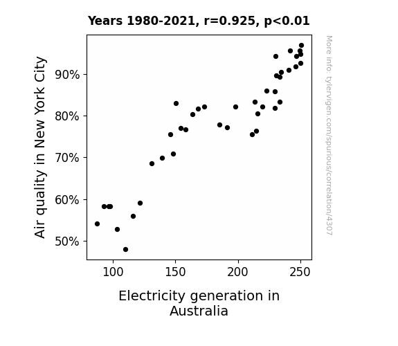 This means 85.6% of the change in the one variable (i.e., Electricity generation in Australia) is predictable based on the change in the other (i.e., Air quality in New York City) over the 42 years from 1980 through 2021.