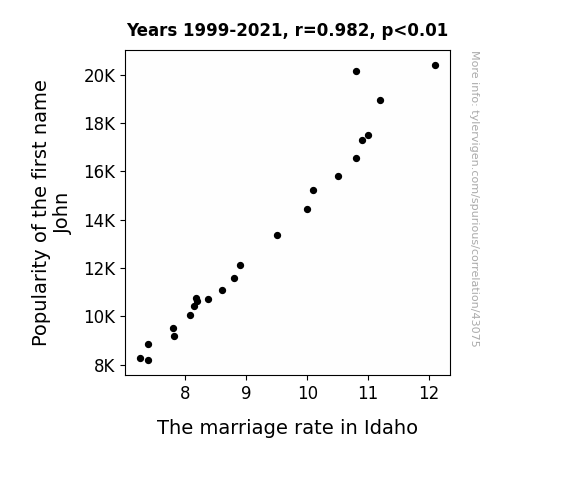 This means 96.5% of the change in the one variable (i.e., The marriage rate in Idaho) is predictable based on the change in the other (i.e., Popularity of the first name John) over the 23 years from 1999 through 2021.