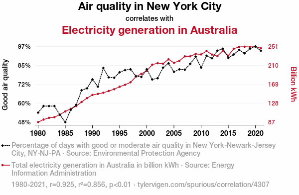 This means 85.6% of the change in the one variable (i.e., Electricity generation in Australia) is predictable based on the change in the other (i.e., Air quality in New York City) over the 42 years from 1980 through 2021.