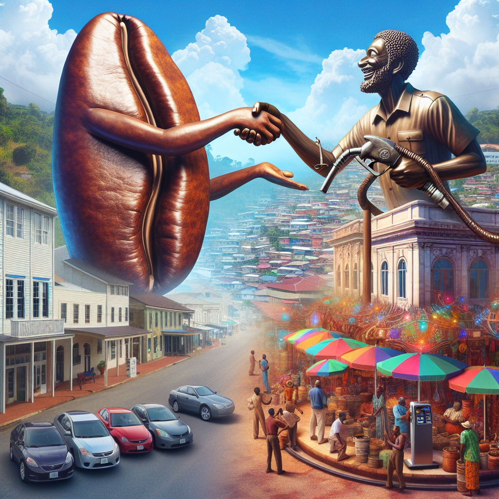 Prompt: Prompt: Generate an image of a towering statue of a grinning coffee bean holding hands with a smiling gas pump. The background depicts a cityscape, showcasing a blend of Staunton, Virginia's serene atmosphere with Cameroon's bustling streets, with clean air intertwining with the aroma of coffee and the demand for petroleum. The image should capture the unique connection and energy exchange between the two distant locations. The depiction should include only scenes, people, and objects, it should not include text or speech bubbles.