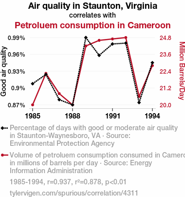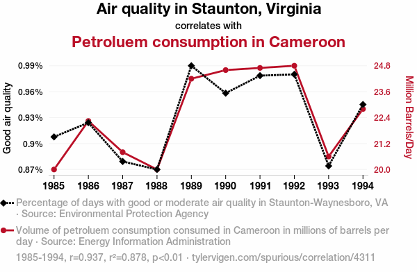 This means 87.8% of the change in the one variable (i.e., Petroluem consumption in Cameroon) is predictable based on the change in the other (i.e., Air quality in Staunton, Virginia) over the 10 years from 1985 through 1994.