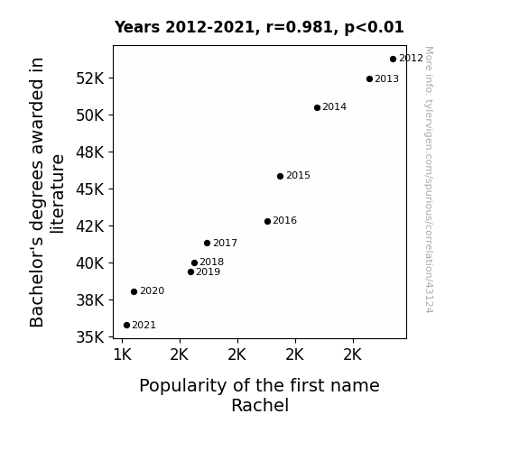 This means 96.3% of the change in the one variable (i.e., Popularity of the first name Rachel) is predictable based on the change in the other (i.e., Bachelor's degrees awarded in literature) over the 10 years from 2012 through 2021.