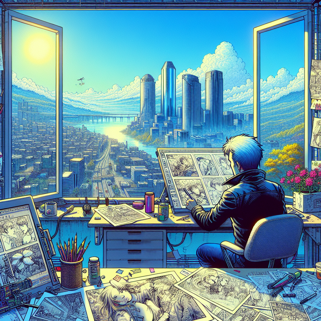Prompt: Generate an image of a cyberpunk-inspired Chattanooga, Tennessee where clean air has replaced the pollution, and the xkcd creator sits at a drawing table surrounded by sketches of romantic scenes. The clear blue skies stretch over the city and a gentle breeze flows through the open window. The depiction should include only scenes, people, and objects, it should not include text or speech bubbles.