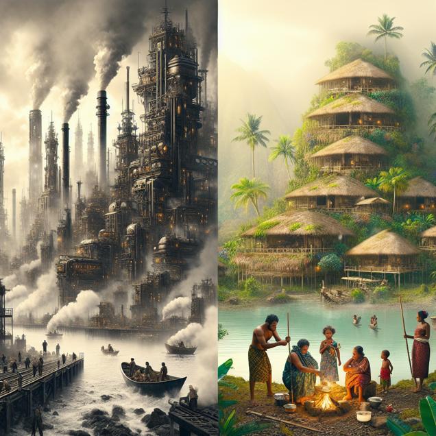 Prompt: Generate an image that showcases a contrast between a steampunk-inspired industrial city shrouded in thick smog and a peaceful Samoan village with families gathered around clean-burning stoves, set against a backdrop of untouched natural beauty. The cityscape should feature towering, intricate steampunk-style buildings emitting smoke and steam, creating a hazy, polluted skyline. In contrast, the Samoan village should exude a serene atmosphere, with families cooking amidst lush greenery and pristine landscapes, emphasizing the use of sustainable fuel sources. The image should evoke a visually striking dichotomy between industrial pollution and sustainable living. The depiction should include only scenes, people, and objects, it should not include text or speech bubbles.