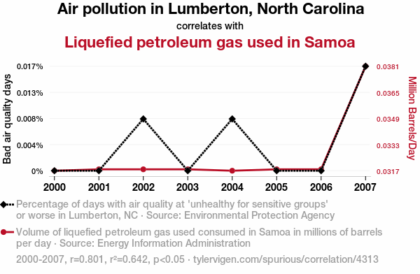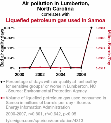 - The spurious research paper: When Gas Meets Polluted Air: Uncovering the Link Between Liquefied Petroleum Gas in Samoa and Air Pollution in Lumberton, North Carolina