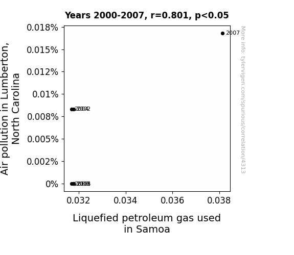 Our analysis revealed a strong positive correlation between the usage of liquefied petroleum gas in Samoa and the levels of air pollution in Lumberton, North Carolina during the period from 2000 to 2007. The correlation coefficient of 0.8013468 and r-squared of 0.6421567 pointed to a robust relationship between the two variables. To put it in layman's terms, the connection between these two seemingly disparate elements was tighter than the grip on a dad's wallet when his kids ask for a raise in their allowance.