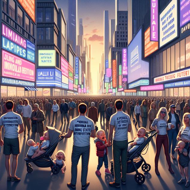 User prompt: Please respond with an image generation prompt that would be likely to create an interesting visual using DALLE-3, using the following style: [ Cyberpunk ] and depicting this scene: In an Illinois town, a bustling street is crowded with people wearing "Vote Libertarian" shirts, eagerly lining up to cast their ballots. Nearby, a group of parents smile and laugh as they push strollers with babies named Killian, exchanging knowing nods and winks as if they are part of a shared understanding of the importance of freedom and individual rights. The scene is a mix of excitement and quiet determination, with a subtle sense of unity between supporters of the Libertarian candidate and admirers of the name Killian, who seem to share a common belief in autonomy and minimal state intervention. Keep the visual depiction simple. Do not include any words or speech bubbles.