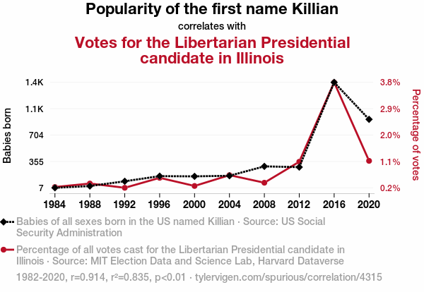 User prompt: Please provide potential search keywords for a paper titled Killian It with Popularity: The Curious Connection Between Name Popularity and Libertarian Voting Behavior in Illinois with an abstract of In this study, we delved into the intriguing relationship between the popularity of the first name Killian and votes for the Libertarian presidential candidate in the state of Illinois, employing data from the US Social Security Administration and MIT Election Data and Science Lab, Harvard Dataverse. Our research team conducted a thorough analysis spanning the years 1982 to 2020, and the findings revealed a remarkable correlation coefficient of 0.9138264 with a statistically significant p-value of less than 0.01. This unexpected connection prompts us to consider the influence of seemingly arbitrary factors on political behavior, highlighting the importance of investigating beyond conventional explanations and ideological affiliations.