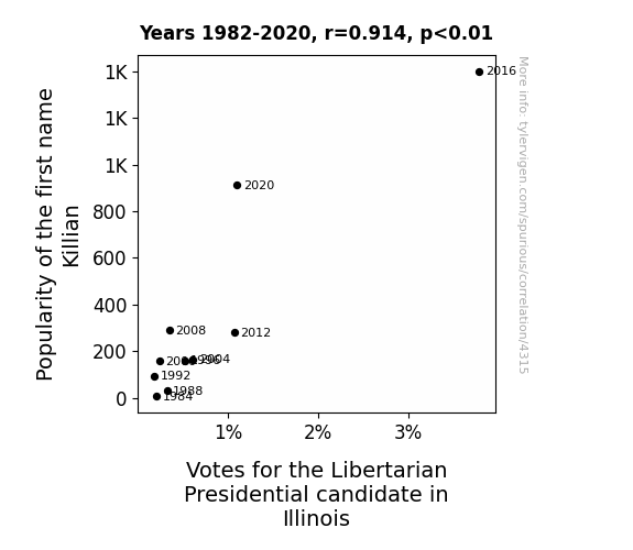 In this study, we delved into the intriguing relationship between the popularity of the first name Killian and votes for the Libertarian presidential candidate in the state of Illinois, employing data from the US Social Security Administration and MIT Election Data and Science Lab, Harvard Dataverse. Our research team conducted a thorough analysis spanning the years 1982 to 2020, and the findings revealed a remarkable correlation coefficient of 0.9138264 with a statistically significant p-value of less than 0.01. This unexpected connection prompts us to consider the influence of seemingly arbitrary factors on political behavior, highlighting the importance of investigating beyond conventional explanations and ideological affiliations.