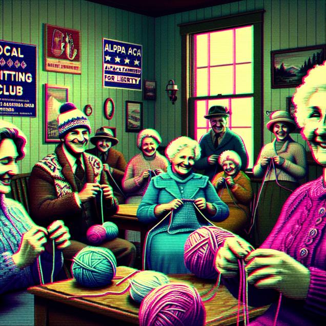 ChatGPT: In a cozy Alaskan town, a group of people gathers around a table, cheerfully knitting with balls of alpaca wool. The air is filled with laughter and chatter as they create beautiful garments. Nearby, a poster proudly displays the "Joelle Knitting Club." In the background, a banner reads "Alpaca Farmers for Liberty," as a crowd rallies around two smiling libertarian senators, expressing their support.