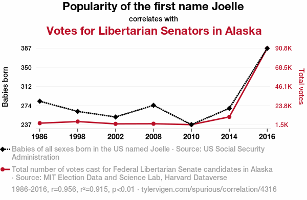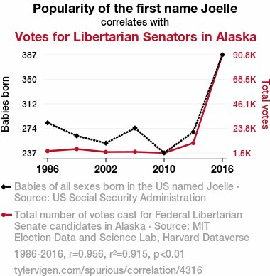 - The spurious research paper: Joelle-itarianism: A Statistical Analysis of the Correlation between Joelle's Popularity and Libertarian Votes for Senators in Alaska