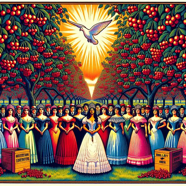 User prompt: Please describe a visual scene that prominently depicts both Republican votes for Senators in Michigan and Age of Miss Earth Peagant winner, in the following situation: As the Republican votes for Senators in Michigan increased, so did the demand for Michigan's famous cherries. This led to a cherry boom, with farmers using age-old techniques to grow plumper, juicier fruit. Unbeknownst to many, the secret fertilizer turned out to be a youth elixir for the skin. As a result, contestants in the Miss Earth Pageant, including the eventual winner, couldn't help but showcase a youthful glow, giving a whole new meaning to age and beauty! So, in a strange twist of fate, the path to the pageant crown was paved with the pits of politics, making it a truly fruitiful affair. And that's how a political sway in Michigan had everyone saying, "Make cherries, not war!". Keep the description simple.