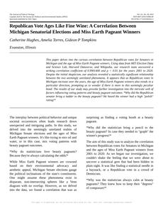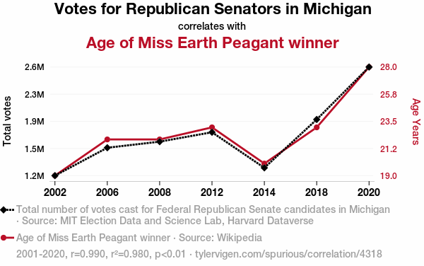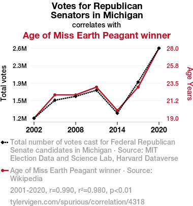 - The spurious research paper: Republican Vote Ages Like Fine Wine: A Correlation Between Michigan Senatorial Elections and Miss Earth Pageant Winners