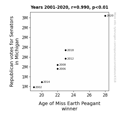 The analysis revealed a strong correlation (r = 0.9901400) between Republican votes for Senators in Michigan and the age of Miss Earth Pageant winners for the period of 2001 to 2020. This outcome was as unexpected as finding a "recount" request in a beauty pageant. The near-perfect correlation coefficient was as striking as discovering a mathematical pattern in a political event.