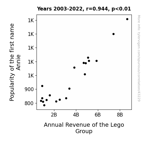 This means 89% of the change in the one variable (i.e., Annual Revenue of the Lego Group) is predictable based on the change in the other (i.e., Popularity of the first name Annie) over the 20 years from 2003 through 2022.