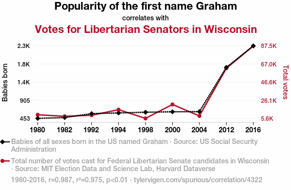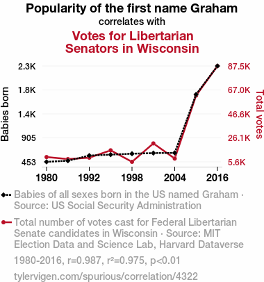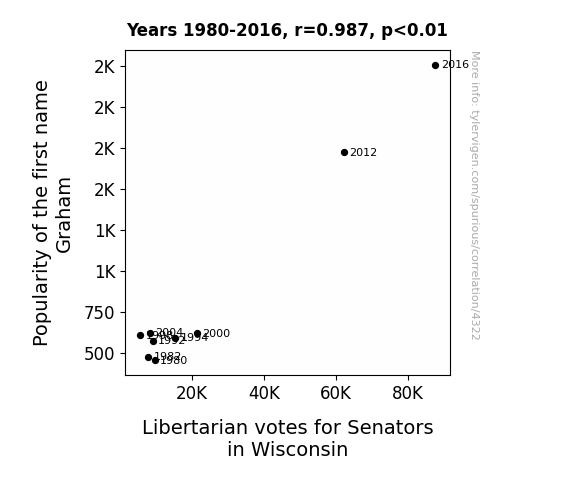 User prompt: Please provide potential search keywords for a paper titled Graham's Number: An Examination of the Correlation between the Name Graham and Libertarian Votes for Senators in Wisconsin with an abstract of This paper delves into the fascinating world of the relationship between the popularity of the first name "Graham" and the Libertarian votes for Senators in the state of Wisconsin. Using data from the US Social Security Administration and the MIT Election Data and Science Lab, Harvard Dataverse, this research unveils a surprising correlation coefficient of 0.9871898 and a p-value less than 0.01 for the years 1980 to 2016. Our findings shed light on the quirky connection between nomenclature and political preferences, inspiring a lighthearted exploration of the impact of names on electoral results.