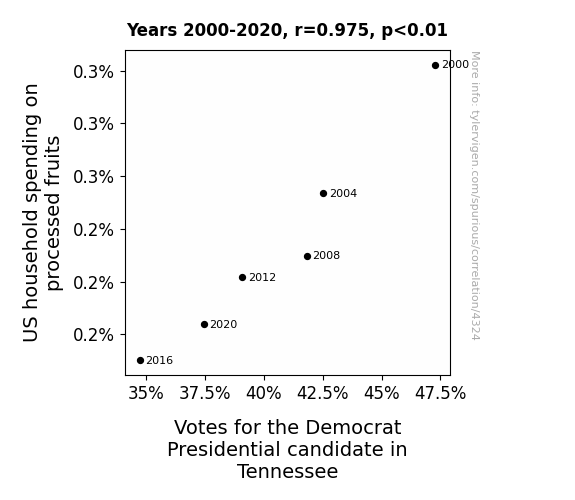 - The spurious research paper: Peeling Back the Layers: A Fruitful Investigation into Household Spending on Processed Fruits and Votes for the Democrat Presidential Candidate in Tennessee