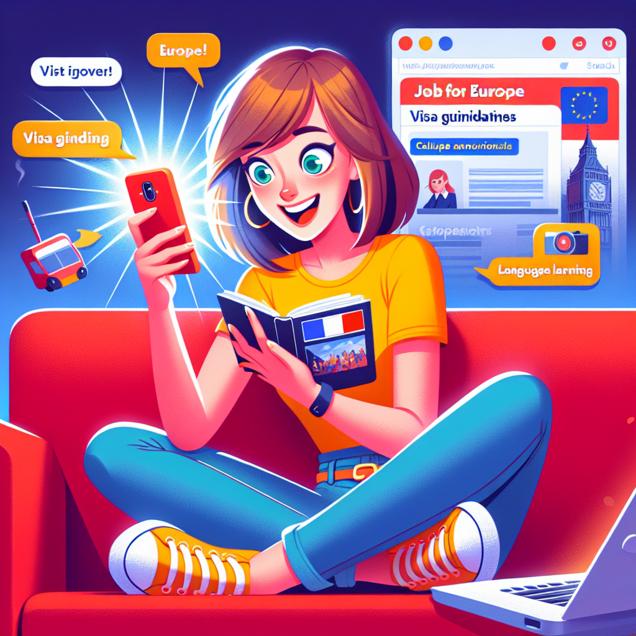 ChatGPT: A young person sits on a bright red couch, engrossed in their smartphone. On the screen, a Be Smart YouTube video titled "10 European Trends You Need to Know" catches their eye, as they eagerly jot down notes. Next to them, a laptop displays a Google search for "how to move to Europe," with multiple tabs open for visa requirements, job opportunities, and language classes. The scene reflects the modern desire to be culturally savvy and well-prepared for a move to Europe.