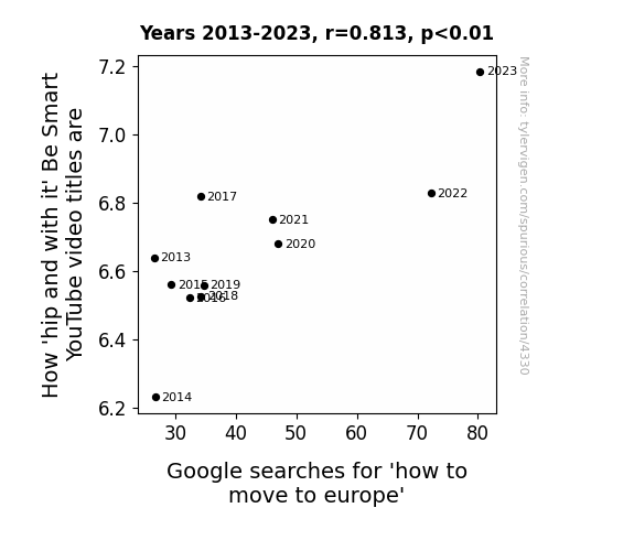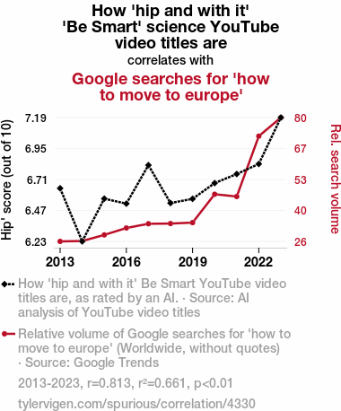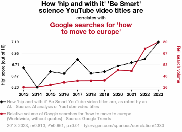 This means 66.1% of the change in the one variable (i.e., Google searches for 'how to move to europe') is predictable based on the change in the other (i.e., How 'hip and with it' 'Be Smart' science YouTube video titles are) over the 11 years from 2013 through 2023.