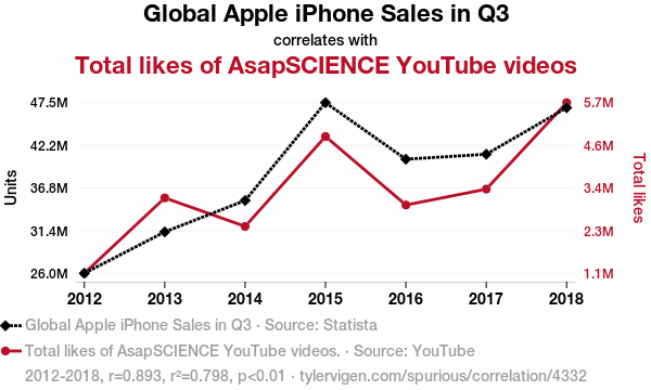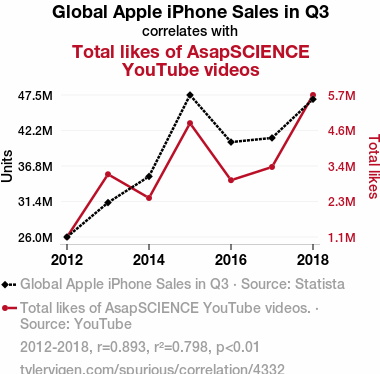 - The spurious research paper: iCan't Believe It's Apples and Likes: Exploring the Surprising Connection Between Global Apple iPhone Sales in Q3 and Total Likes of AsapSCIENCE YouTube Videos