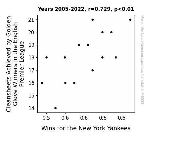 This means 53.1% of the change in the one variable (i.e., Wins for the New York Yankees) is predictable based on the change in the other (i.e., Cleansheets Achieved by Golden Glove Winners in the English Premier League) over the 18 years from 2005 through 2022.
