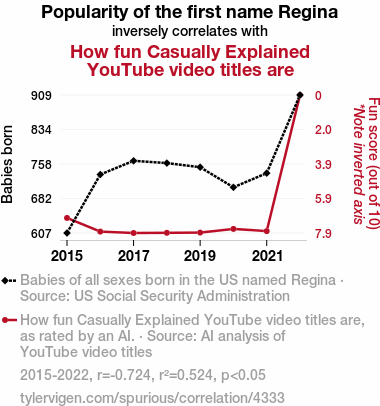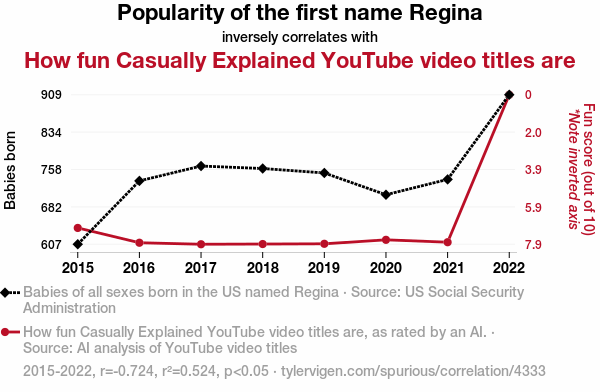 - The spurious research paper: Regina-phobic Revelations: A Statistical Analysis of the Relationship Between the Popularity of the First Name Regina and the Entertainment Value of Casually Explained YouTube Video Titles