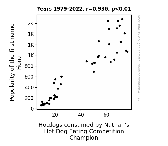 This means 87.7% of the change in the one variable (i.e., Hotdogs consumed by Nathan's Hot Dog Eating Competition Champion) is predictable based on the change in the other (i.e., Popularity of the first name Fiona) over the 44 years from 1979 through 2022.