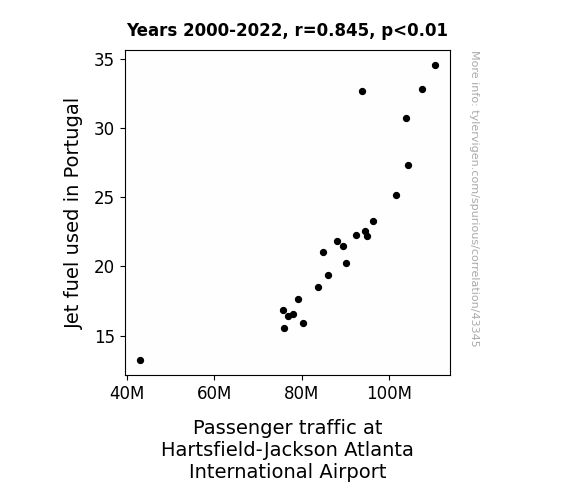 This means 71.3% of the change in the one variable (i.e., Passenger traffic at Hartsfield-Jackson Atlanta International Airport) is predictable based on the change in the other (i.e., Jet fuel used in Portugal) over the 23 years from 2000 through 2022.