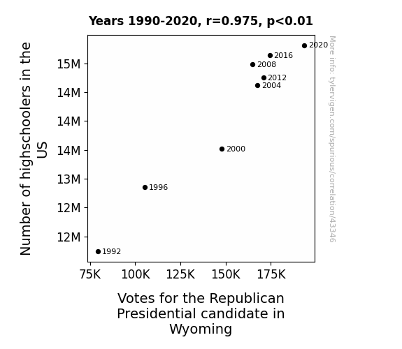 This means 95.1% of the change in the one variable (i.e., Votes for the Republican Presidential candidate in Wyoming) is predictable based on the change in the other (i.e., Number of highschoolers in the US) over the 8 years from 1990 through 2020.