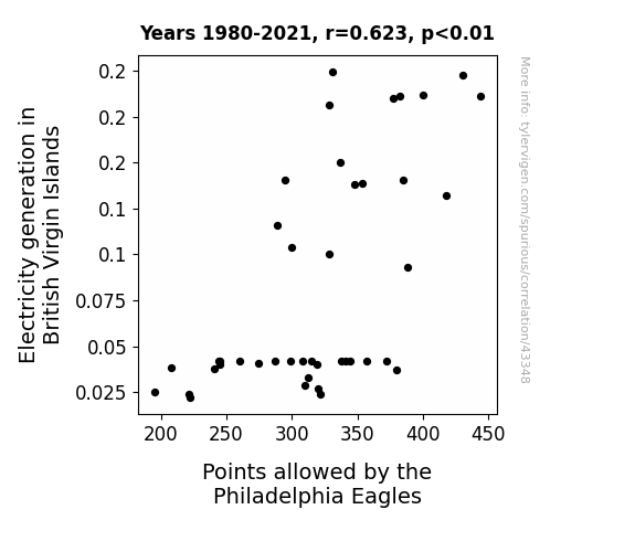 This means 38.8% of the change in the one variable (i.e., Points allowed by the Philadelphia Eagles) is predictable based on the change in the other (i.e., Electricity generation in British Virgin Islands) over the 42 years from 1980 through 2021.