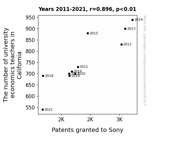 This means 80.3% of the change in the one variable (i.e., Patents granted to Sony) is predictable based on the change in the other (i.e., The number of university economics teachers in California) over the 11 years from 2011 through 2021.