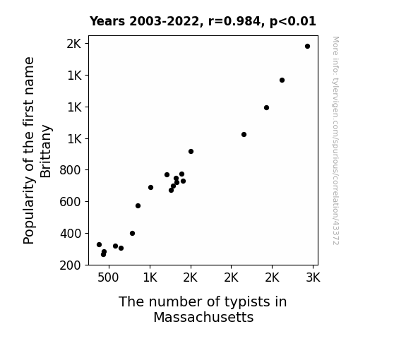 This means 96.7% of the change in the one variable (i.e., The number of typists in Massachusetts) is predictable based on the change in the other (i.e., Popularity of the first name Brittany) over the 20 years from 2003 through 2022.