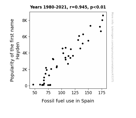 This means 89.3% of the change in the one variable (i.e., Fossil fuel use in Spain) is predictable based on the change in the other (i.e., Popularity of the first name Hayden) over the 42 years from 1980 through 2021.