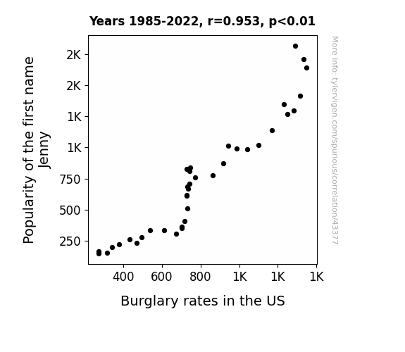 This means 90.8% of the change in the one variable (i.e., Burglary rates in the US) is predictable based on the change in the other (i.e., Popularity of the first name Jenny) over the 38 years from 1985 through 2022.