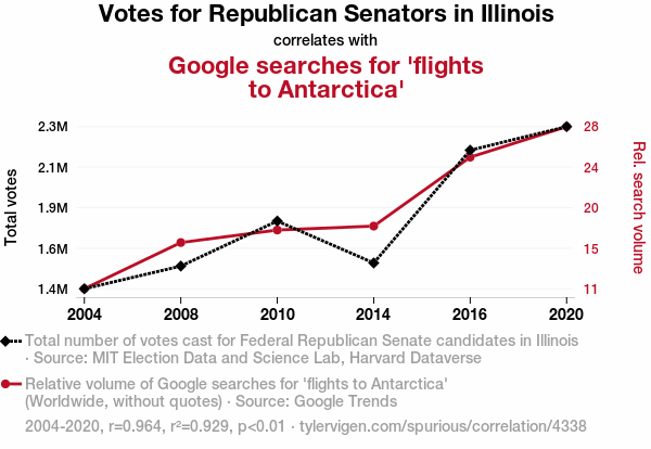 Republican votes Illinois, Google searches flights Antarctica, correlation coefficient, political affiliation, wanderlust, icy escapades, red state cool skies, elephant Antarctic, pachyderm paradox