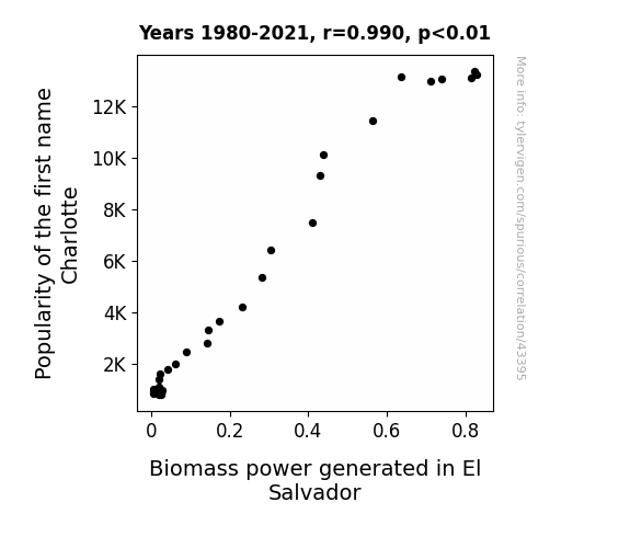 This means 97.9% of the change in the one variable (i.e., Biomass power generated in El Salvador) is predictable based on the change in the other (i.e., Popularity of the first name Charlotte) over the 42 years from 1980 through 2021.