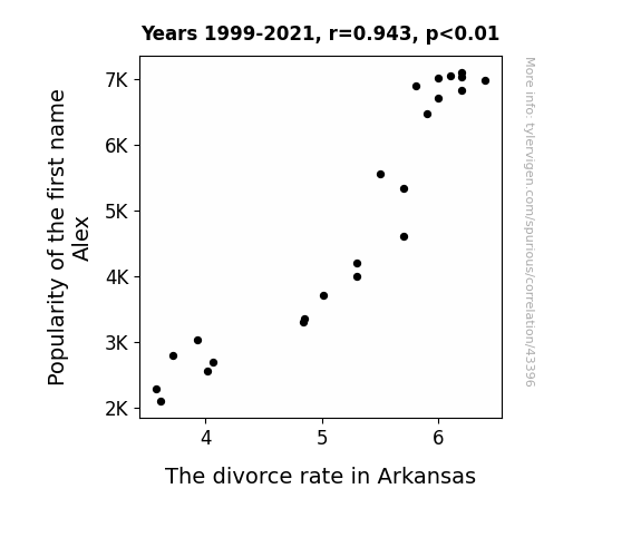 This means 88.9% of the change in the one variable (i.e., The divorce rate in Arkansas) is predictable based on the change in the other (i.e., Popularity of the first name Alex) over the 23 years from 1999 through 2021.