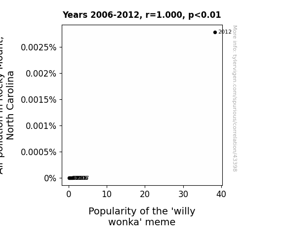 This means 99.9% of the change in the one variable (i.e., Popularity of the 'willy wonka' meme) is predictable based on the change in the other (i.e., Air pollution in Rocky Mount, North Carolina) over the 7 years from 2006 through 2012.