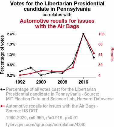 - The spurious research paper: The Air Bags and Libertarians: A Correlation Analysis of Automotive Recalls and Libertarian Presidential Votes in Pennsylvania