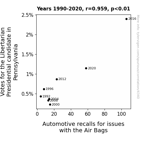 The correlation coefficient of 0.9587744 and the r-squared value of 0.9192484 provide robust evidence of the connection between votes for the Libertarian candidate and automotive recalls for air bag-related issues. These results underline the statistical significance of our findings, reinforcing the idea that the alignment between these seemingly incongruous phenomena is not purely a flight of fancy but a bona fide relationship worthy of scholarly consideration. It seems that there is more to the political landscape of Pennsylvania than meets the eye, and perhaps a dash of maverick spirit in the voting booth has an unforeseen resonance with vehicular technology.