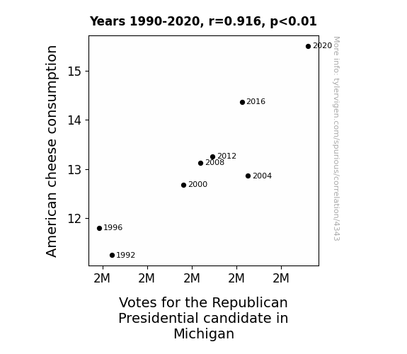- The spurious research paper: The Cheddar Vote: American Cheese Consumption and Republican Candidate Preference in Michigan