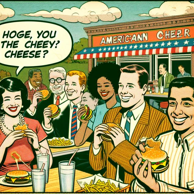 ChatGPT: Generate a comic-book-style illustration with muted colors and a dotted halftone pattern from the 1960s, depicting a cozy diner in Michigan. In the illustration, people are savouring slices of American cheese on their burgers and sandwiches, as cheesy jokes and puns fill the air, creating a gouda mood. The patrons are depicted smiling and engaging in lighthearted conversations, feeling more relaxed and playful. As they leave the diner, they walk past a voting booth adorned with a sign supporting the Republican Presidential candidate, and some of them are shown expressing their support, feeling feta about the candidate's promises. The cheesy ambiance seems to have influenced their political leanings, as the correlation between American cheese consumption and support for the candidate becomes apparent. This collage forms a delightful and captivating visual narrative.