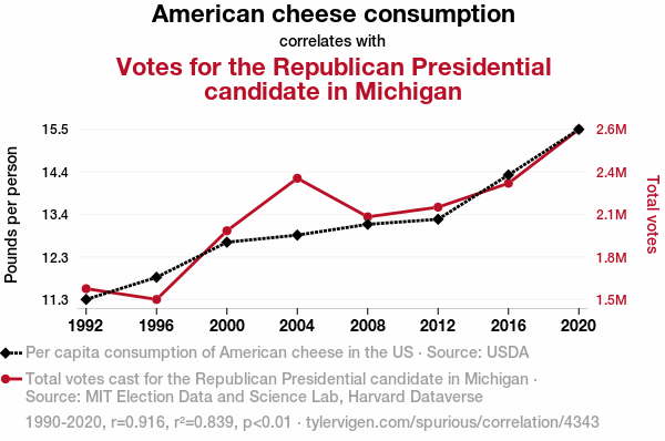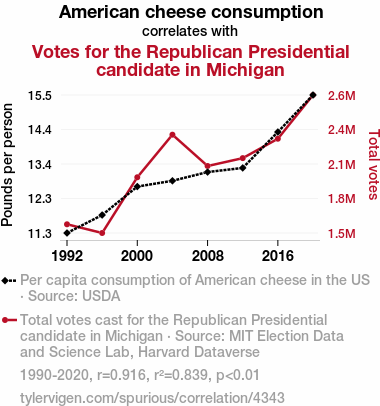 - The spurious research paper: The Cheddar Vote: American Cheese Consumption and Republican Candidate Preference in Michigan