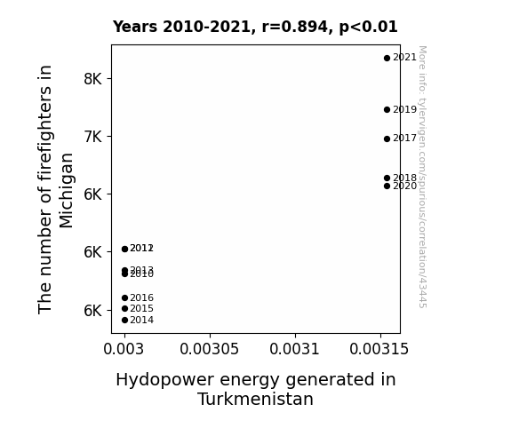 This means 79.9% of the change in the one variable (i.e., Hydopower energy generated in Turkmenistan) is predictable based on the change in the other (i.e., The number of firefighters in Michigan) over the 12 years from 2010 through 2021.