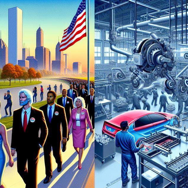 Prompt: Prompt: Generate an image of a high-tech scene where a parade of voters is pouring into polling stations in Indiana to cast their ballots for the Libertarian Presidential candidate. Simultaneously, at a nearby automotive factory, the parking brake component assembly line is experiencing a surge of free-spirited energy, with parts rebelling against their traditional limitations. Capture the juxtaposition of the orderly voting process and the chaotic rebellion of the parking brake parts in a futuristic setting. The depiction should include only scenes, people, and objects, it should not include text or speech bubbles.