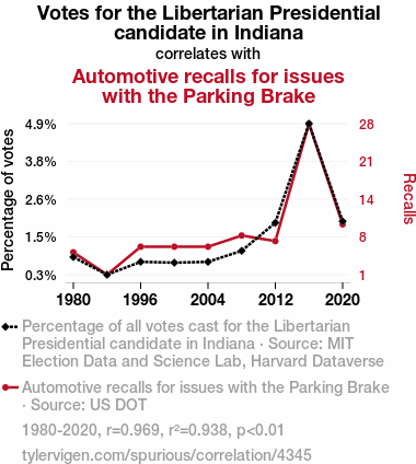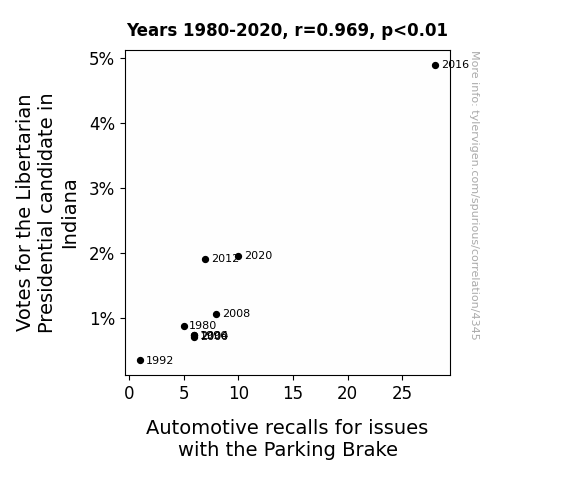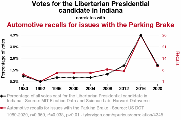 The results of our analysis provided an unexpectedly robust correlation between the number of votes for the Libertarian presidential candidate in Indiana and automotive recalls related to issues with the parking brake. The correlation coefficient of 0.9687156, with an r-squared value of 0.9384099, demonstrated a remarkably strong relationship between these seemingly incongruous variables for the period spanning from 1980 to 2020.