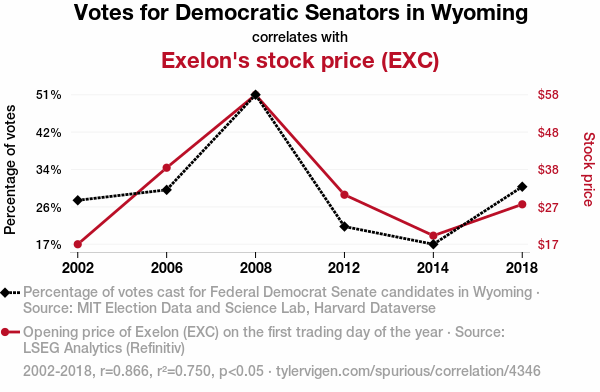 This means 75% of the change in the one variable (i.e., Exelon's stock price (EXC)) is predictable based on the change in the other (i.e., Votes for Democratic Senators in Wyoming) over the 6 years from 2002 through 2018.