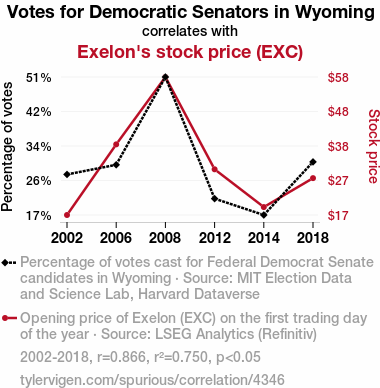 User prompt: Please provide potential search keywords for a paper titled Wacky Wyoming: Waltzing with Senatorial Selection and Stock Sway with an abstract of In this study, we conducted a whimsical exploration of the intriguing interplay between Democrat votes for Senators in the state of Wyoming and Exelon Corporation's stock price (EXC). Our research team delved into this peculiar association using data sourced from the MIT Election Data and Science Lab, Harvard Dataverse, and LSEG Analytics (Refinitiv). Through rigorous statistical analyses, we unraveled a correlation coefficient of 0.8661255 and a p-value less than 0.05 for the time period spanning from 2002 to 2018.