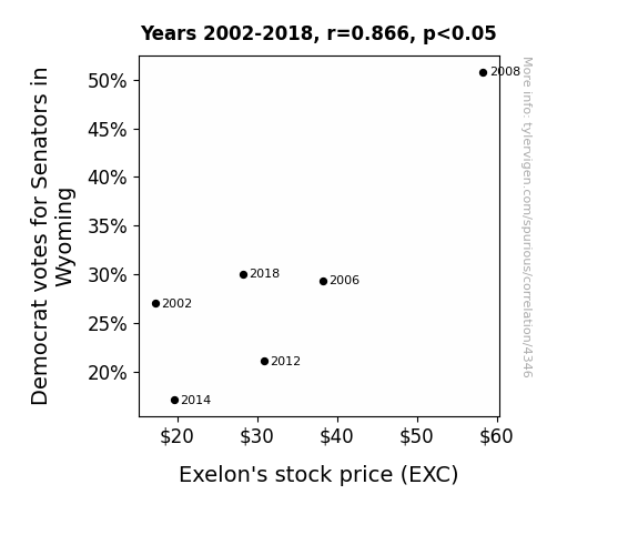 The strong positive correlation we uncovered between Democrat votes for Senators in Wyoming and Exelon Corporation's stock price (EXC) from 2002 to 2018 might leave one feeling like the punchline of a well-crafted mathematical joke that defies all expectations. It’s akin to the feeling of solving a complex equation, only to realize that the solution reveals a hidden punchline that sparks laughter and curiosity in equal measure, much like encountering a herd of statistical analysts deliberating in the wilderness.